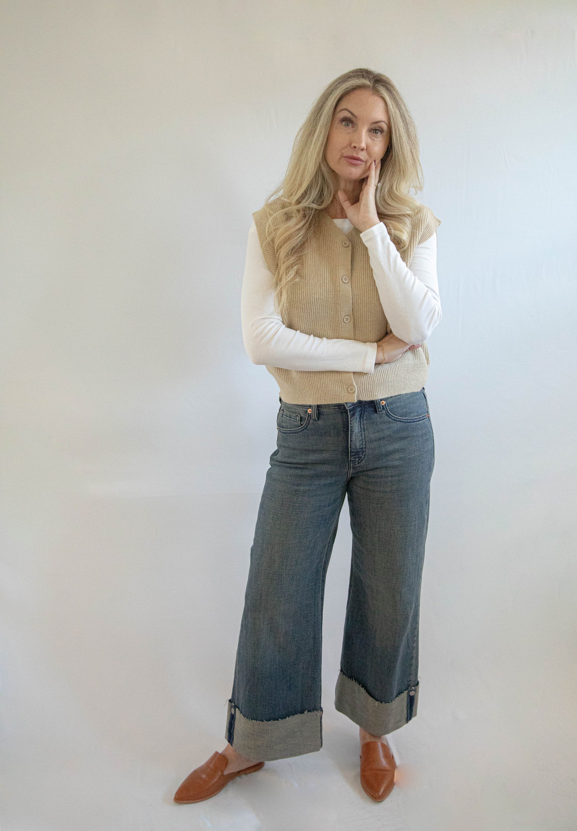 These wide leg, high rise jeans are perfectly cuffed. They have tummy control while still being super comfortable.