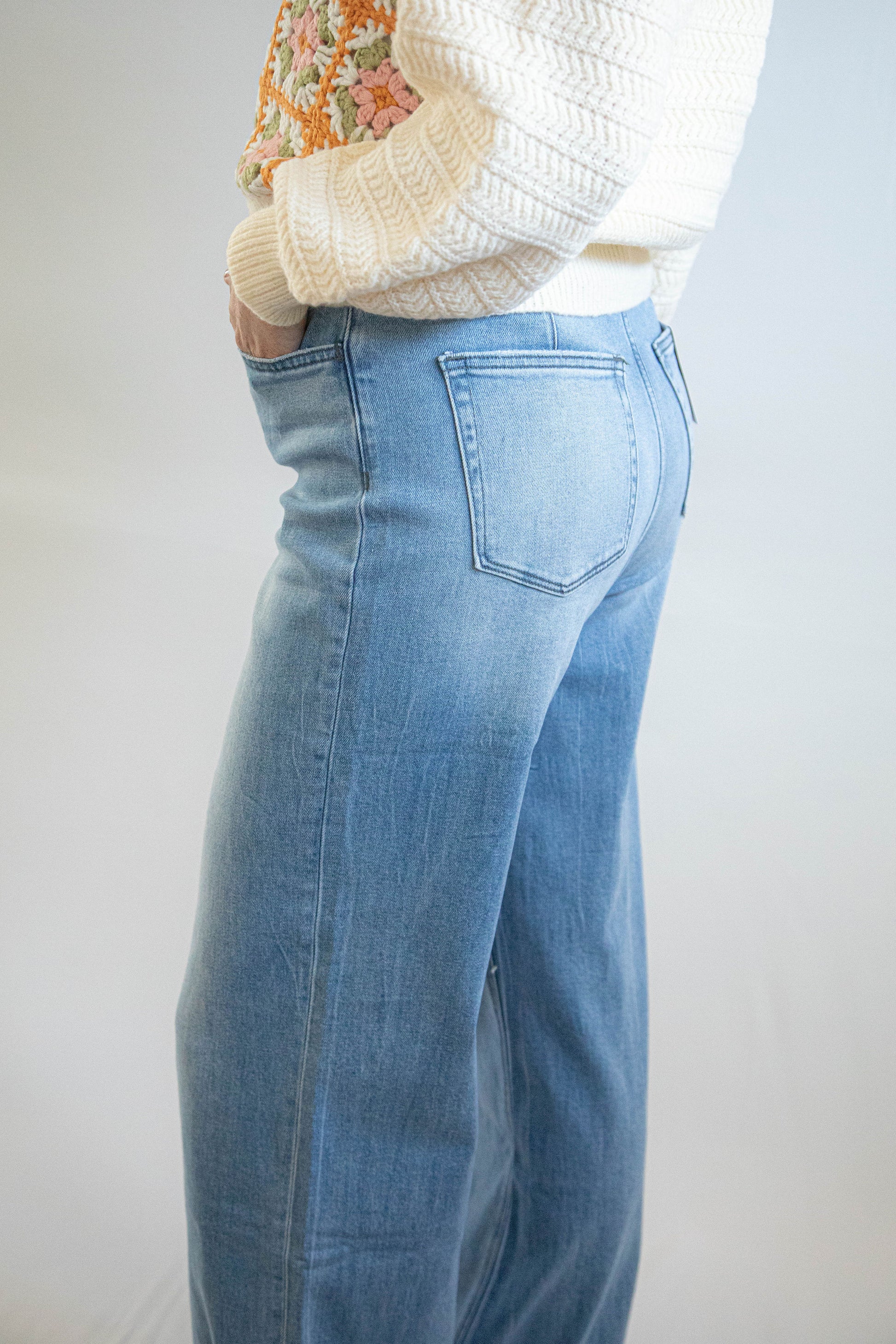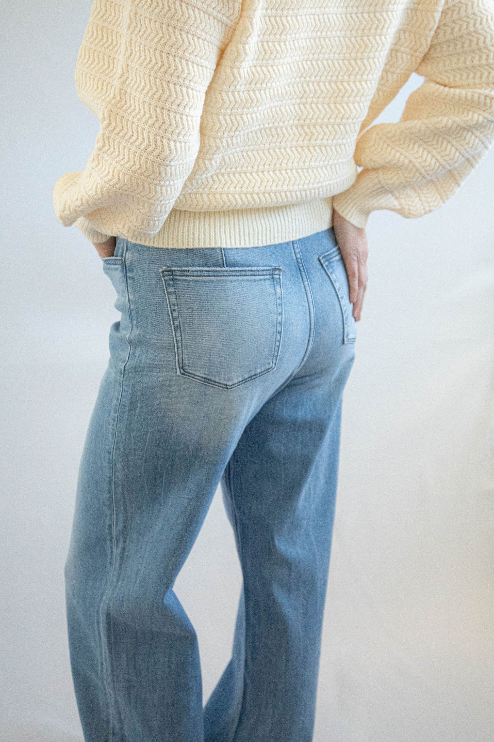 These jeans have comfort stretch denim with a super high rise waist. The hem is left raw and looks so good (you could easily cut them to make them shorter if needed... measure a few times first to be sure you get it right).